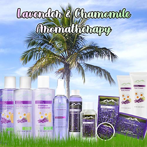Stress Release Bubble Bath ~ Body Wash with Shea Butter ~ Hair Replenish Shampoo & Conditioner ~ Skin Loving Hand Cream ~ Skin Repairing Body Butter ~ Aromatherapy Bath Salts ~ Shea Butter Bath Caviar ~ 3 Fizzy Bath Bombs ~ Handmade Essential Oil Soap Bar ~ Lavender Chamomile Body Mist ~ Hand-poured Aromatherapy Candle ~ Wooden Reflexology Stick ~Wooden Comb ~ Pumice & Brush Combo Stick ~ Spa Bath Mitts ~ Luxury Comfort Bath Pillow ~ Extra Long back scrubber loofah ~ Mesh Bath Pouf ~ Lavender Essential Oil ~ Lavender Massage Oil ~ Aromatherapy Essential Oil Necklace