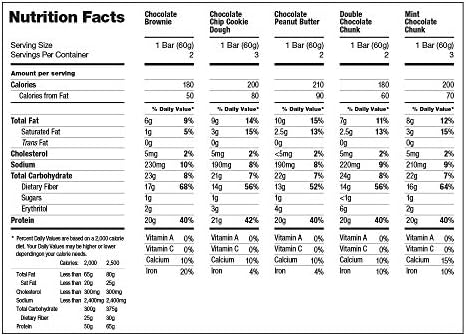 Chocolate and more chocolate! An assortment of 5 of the following flavors: Chocolate Chip Cookie Dough x3 Bars- Chocolate Chip Cookie Dough-21g of Protein, 3g of net Carbs, 190cal; Double Chocolate Chunk x2 Bars-20g of Protein, 4g of net Carbs, 180cal; Mint Chocolate Chunk x3 Bars-20g of Protein, 4g of net Carbs, 190cal; Chocolate Brownie x2 Bars-20g of Protein, 6g of net Carbs, 170cal; Chocolate Peanut Butter x2 Bars-20g of Protein, 3g of net Carbs, 160cal.