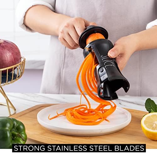 You’ll love how easy it is to create delicious healthy meals with our vegetable spiralizer. This handheld veggie slicer and zoodle maker is a convenient and easy tool for your kitchen. Simple functionality, the spiralizer turns out thin or thin vegetables slices or shreds perfect for vegetable pasta, stir fries and even great for garnishes. No need to miss your favorite carb heavy foods, this fun kitchen tool will help you create pasta like dishes you’ll love.