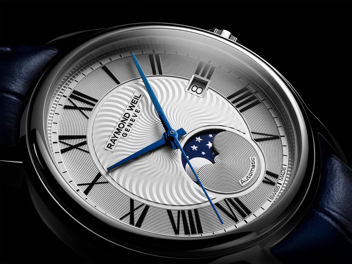 A complete automatic collection for men. The classic maestro design is offered in a range of features from moon-phase indicators, open balance wheels & skeleton dials. This automatic men’s watch features a stainless steel case and blue genuine leather strap with white stitching making it a striking accessory to add to your wardrobe. The cool tones make the blue accents in the moon phase aperture and watch hands stand out against the silver dial. Moon phase watches show the various phases of the moon, which has always provided time with an orientation. The moon was the first method of telling the passing of months.
