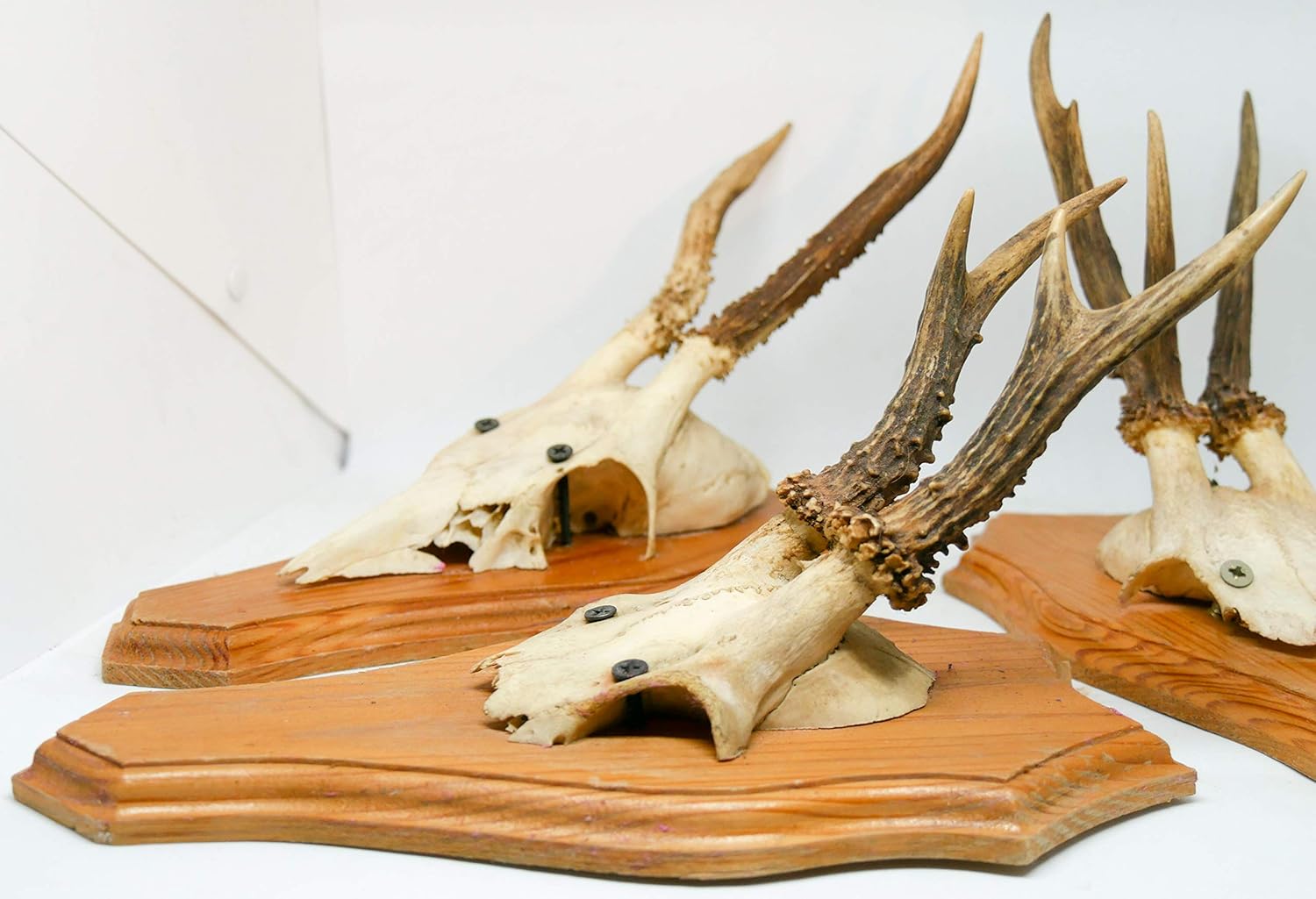 You are buying 3 roe deer (Capreolus capreolus) skulls with antlers mounted to the hand-carved wooden shield plaque exactly as seen in the photography. The skulls with antlers you will receive will differ in very small features from the one seen. Quality is the same or higher. Home Decor Gothic Shamanic Ornament.