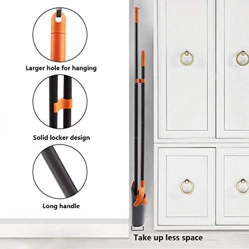 Dustpan Lock and Compact Storage : Dustpan locks in open position for easy emptying , can easily dispose of dustpan’s contents into the garbage. compact dustpan broom set design lets you hang the broom and dustpan together on the wall. It is a great way to save storage space .