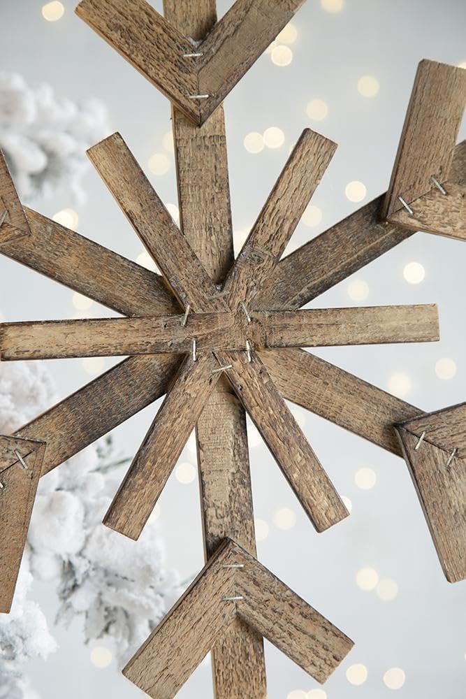Marrying festive elegance with a touch of rustic charm, each snowflake in this set boasts a masterful design, with detailed layered arms, a warm, grained brown finish, and a convenient loop at the head.