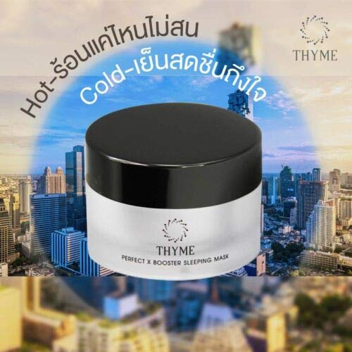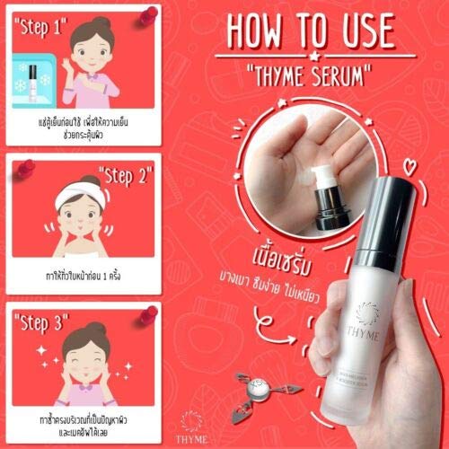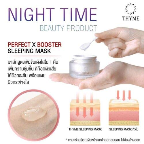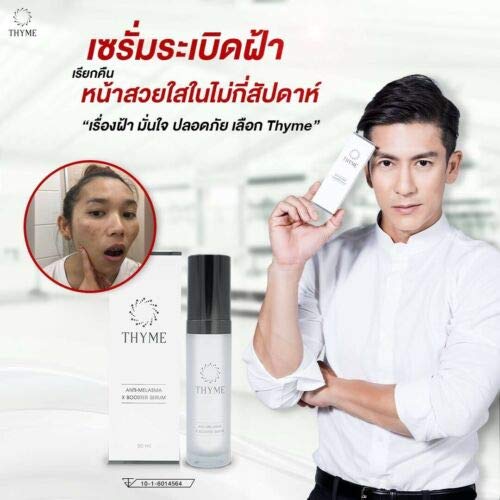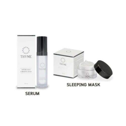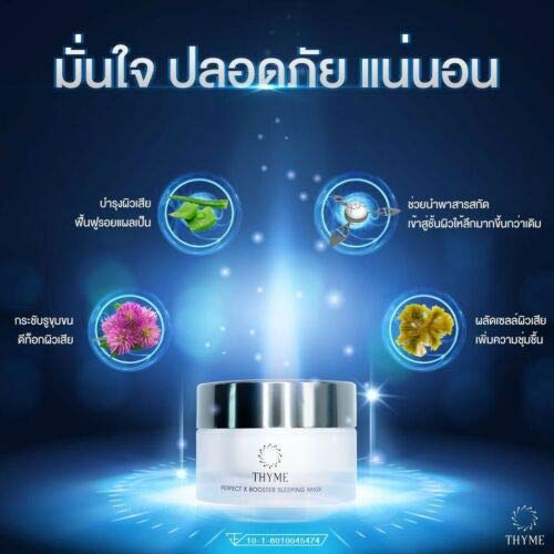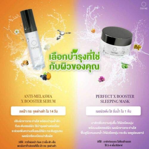 SetThyme Serum 2 Boxes.Sleeping Mask 2 Boxes.Thyme Anti-melasma X booster serum Wrinkles Whitening Dark Spot 30 ml.Maintenance products Light texture Rich in skin nourishment from X50 Pure white, EPS white and Eternal white extracts to reduce dark spots, freckles on the face to look faded. Make the face look more radiant. And also combined with Sodium hyaluronate which helps to increase moisture, feel smooth and soft Smooth skin Naturally looks youthful when used continuouslyResults after use: Smooth facial skin, freckles, dark spots. Even skin color As well as the pores are firmerHow to use: Apply to skin all over the face 2 times a day in the morning and evening and repeatedly apply on areas that are freckles, dark spots.Caution: should test for allergic reactions before useProduct type: Clear color product Contained in a opaque pump bottleNet volume: 30 ml.Quantity : 2 BottlesPackaging style: White-gray square box, Hot Stamp, silver colorDuration: From the product date until the expiration date can be stored for 2 years.Notification number: 10-1-6014564the main components1. X50 Pure White CC Solution (PF) [Spain]: Helps to tone the skin To brighten and white With an innovation in delivering messages directly to the target cells2. Eternal White TM [Germany]: Helps the skin look more radiant within a short time. With a working mechanism that can reduce skin pigmentation3. EPS White P [France]: Reduces pigment production. Prevent pollution that harms the skin Brightens skin4. Radianskin PW LS 9918 [Germany]: inhibits pigment release Melanin enters the skin cells Inhibit release Melanin pigment into the skin cells Protect the skin from UVB rays. That is the cause of skin problems, dullness, and inflammation, irritation of the skin Safety tested 100%5. Dermawhite WF BC09993 [Germany]: brightens the skin after using the product for just 2 weeks. Improv