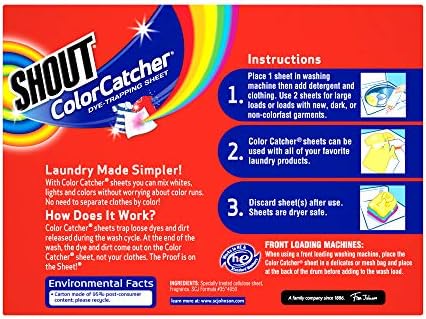DetailsDid you know that some colors run every time you do the laundry? It’s true. And these loose dyes can easily discolor and ruin other articles of clothing in the wash. But with Shout Color Catcher, you can help prevent color runs and protect clothesNobody wants dyes bleeding onto other items of clothing in the laundry. Shout Color Catcher sheets absorb and trap loose dyes in your wash water, safeguarding your clothes from color bleeds and helping to preserve original colors. Use Shout Color Catcher sheets in every load to keep clothes looking vibrant and bright!Sheets lock up loose dyes found in the wash water to prevent dyes from running or bleeding onto other clothes.The proof is on the sheet-each sheet changes color as it absorbs these loose dyes.Helps save you time by reducing the need for sorting.Helps save you money by reducing the need for half-size loads. DirectionsStep 1: Toss one Color Catcher cloth (or 2 for larger loads) in the wash. Use your detergent, Shout stain remover, and other laundry products.Step 2: The Color Catcher cloth will change colors once it absorbs and traps loose dyes. Discard after each wash. (It is safe to go in the dryer.) Do not flush.Step 3: Your clothes stay vibrant and new wash after wash!Effectiveness cannot be guaranteed where there are large amounts of dye bleed from non-colorfast garments.Use reasonable care when washing whites with colors and when washing new garments for the first time.Note: Effectiveness not guaranteed if large amounts of dye bleed from non-colorfast garments. Use reasonable care when washing whites with colors and when washing new garments for the first time.WarningsKeep out of reach of children.