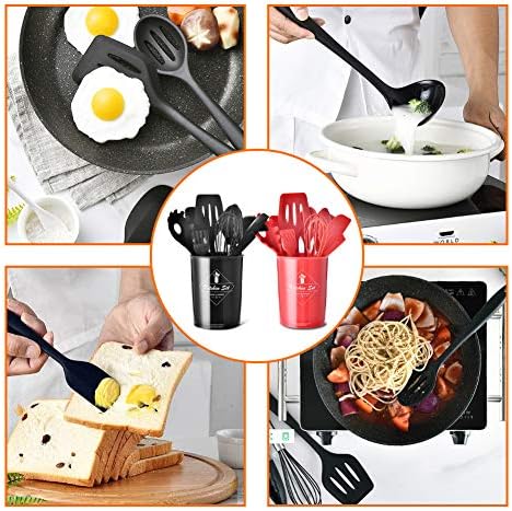 1.The Kitchen Utensil Set–You will get 10pcs cooking tools set and a Storage bucket.And you can also choose the set contains hooks,Red and black,will suit your kitchen well.
