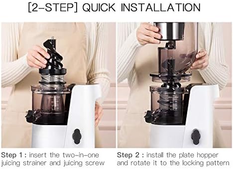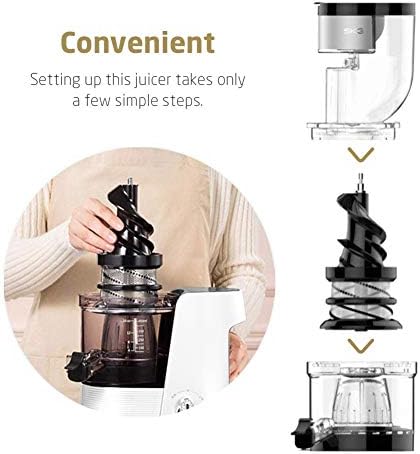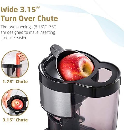 WIDE CHUTE — The 3.15” (80mm) turn over cup allows for large fruits and vegetables to enter the juicer easily.MORE NUTRITIOUS — SKG A10 Juicer can prevents the rapid oxidation which can be caused by the high-speed spinning of a centrifugal juicer.MORE JUICE — SKG A10 Juicer produces more juice (Orange 70%, Pear 81.3%, Apple 78%, Celery 80.5%, Carrot 55%).EASY (DIS-) ASSEMBLY AND CLEAN — Takes only a few simple steps to assemble and designed to efficient cleaning process.SUPERIOR QUALITY — All working parts are made of high quality food grade anti-oxidation materials.