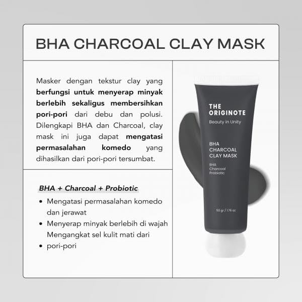 The Originote BHA Charcoal Clay Mask properties Helps clean the skin and makes the skin feel more firm. Helps make the skin smooth. Helps remove dead skin cells. Helps make the face bright. Helps treat blackheads and other acne problems on the face Helps exfoliate the skin and helps remove excess oil on the face. How to use After cleaning the face Use the mask all over the face. Avoid the eyes and mouth area. Leave it on for about 10-15 minutes, then rinse with clean water. Use 1-2 times a week for the most effective results.