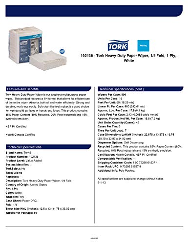 Tork Heavy-Duty Paper Wiper is our toughest multipurpose 1-Ply paper wiper. This product features a 1/4 format that allows for efficient use of the entire wiper. Absorbs both oil and water efficiently. Strong and durable, won’t tear easily. Soft cloth-like feel makes it a good choice for wiping solid surfaces or hands and faces. This product contains 85% Paper Content (80% Recycled Fiber, 20% Post Industrial) and 15% Synthetic Emulsion. White. NSF Certified P1 Rated. Health Canada Certified.