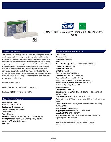 The Tork Heavy-Duty Cleaning Cloth is a reusable, strong and absorbent multipurpose cloth especially for janitorial and industrial cleaning applications. This cloth can be used in the Tork Folded Wiper/Cloth Dispenser that protects the refills from dirt and offers one-at-a time dispensing to reduce consumption and waste. Compatible with most chemical solvents. Picks up and releases solvents more efficiently than textile products which reduces consumption. Heavy-Duty nonwoven – designed to protect your hands from heat and metal scraps. Reusable, strong, durable wiper – excellent rental towel and rag replacement. exelCLEAN technology – for a fast professional cleaning result. Health Canada Certified. HACCP International Food Safety Certified (FZS). Can be used with the Tork 207328, 654021 and 6540281 dispensers (Tork W4 System).