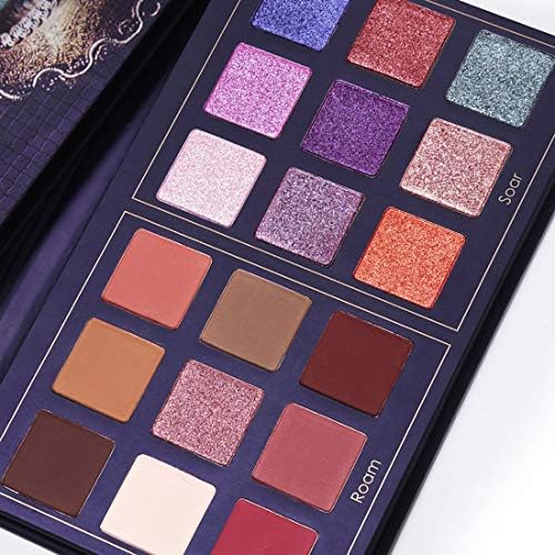 The palette is included 8 velvet matte colors and 10 shimmer glow colors. The left side Roam is red-orange warm shade. You can use it to create passionate eye makeup at work or date. bring energy for all seasons. The right side Soar is coolest holographic shimmer shade. You can use it to create sexy futuristic party makeup. You can also combine the Roam eyeshadow to makeup your own style.