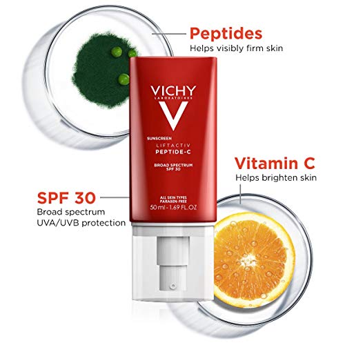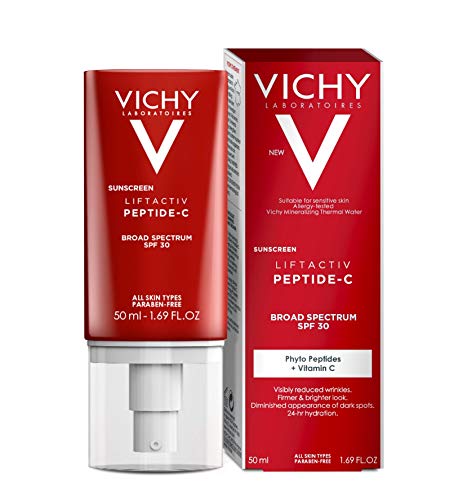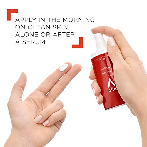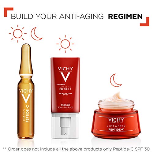 Amazon is an authorized seller of Vichy products. Vichy LiftActiv Peptide-C is a daily anti-aging sunscreen moisturizer with broad spectrum UVA & UVB SPF 30 protection. This face moisturizer is formulated with Phyto Peptides, Vitamin C and Vichy Mineralizing Thermal Water to help correct signs of aging including wrinkles, dull skin, loss of contour definition and loss of firmness. Creamy texture with allergy-tested, light floral fragrance transforms into a powder-feel. LiftActiv Peptide-C visibly reduces wrinkles, brightens and diminishes the appearance of discoloration. Skin looks contoured, lifted & feels firmer and hydrated for 48-hours. Formulated with dermatologist grade ingredients: Phyto Peptides are of plant origin & are short fragments of proteins naturally derived from green peas capable of targeting aging signs to help visibly lift and firm skin’s appearance. Vitamin C is an antioxidant known to help brighten skin, help reduce the appearance of skin aging, and help protect against skin stress. Vichy Mineralizing Thermal Water is naturally enriched with essential minerals. Sourced from the heart of the French volcanoes, Vichy Mineralizing Thermal Water charges itself with 15 minerals to help strengthen the skin’s moisture barrier to help protect skin against external elements. RESULTS: From Day 1: Improved skin tonicity & visible firmness. 48-hour hydration. After 4 weeks: Reduced wrinkles including crow’s feet and forehead wrinkles. Brighter looking skin & contoured look. After 8 weeks: Diminished appearance of discoloration. Skin feels firmer. Vichy LiftActiv Peptide-C Moisturizer is: For all skin types, including sensitive. Paraben-free, Allergy-tested fragrance, Non-sticky, Non-shiny. Tested under dermatological control for safety. Apply morning & evening on clean, dry skin either alone or after Vichy LiftActiv Vitamin C Serum. Avoid eye area.