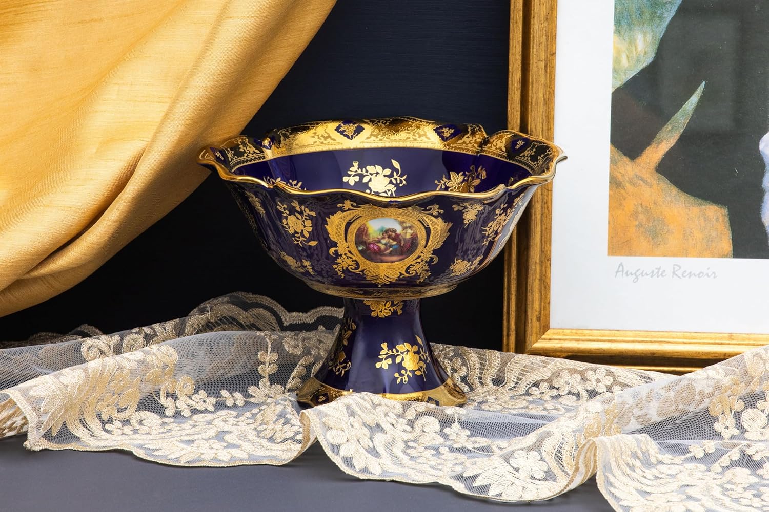 Enhance your home decor with the Royalty Porcelain Blue Fruit Bowl on Stand, a masterpiece that combines elegance and functionality. Standing 6 inches high, this exquisite bowl is perfect for adding a touch of vintage charm to your serving collection. Its classic blue and gold design, adorned with a 24K gold leaf ‘Second Date’ Limoges ornament, makes it an eye-catching centerpiece for any kitchen table or dining room.