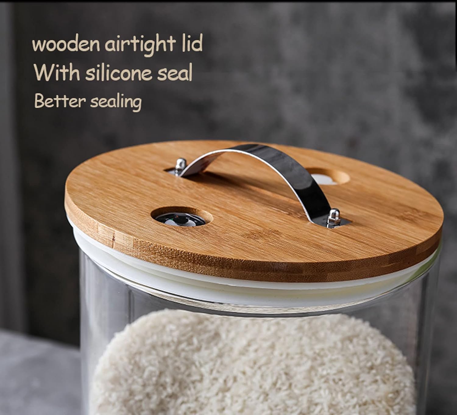 [High-Quality Wooden Cover]: The wooden cover of the food dispenser is equipped with a stainless steel handle, which is reinforced with screws, making it more durable. The inner surface is designed with a widened silicone sealing ring, which has a stronger sealing performance.