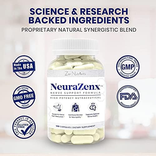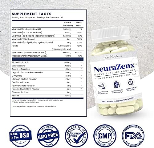 When your nerves are not functioning properly, it can cause you severe discomfort and painful sensations, affecting your day-to-day life. For optimal nerve health, you need Neurazenx by Zen Nutrients. Our scientifically formulated neuropathy pain relief for feet works as a safe and effective solution ensuring proper nerve function. It contains premium, pharmaceutical grade ingredients that work together to deliver your desired results. This proprietary blend is packed with these tried and tested ingredients, plus key vitamins and minerals: Alpha Lipoic Acid (1200mg) Benfotiamine (400mg) Turmeric Curcumin L-Arginine L Carnitine Moringa oleifera Vitamin C Vitamin D3 B12 Vitamins Vitamin B2 Vitamin B6 Vitamin B9 Vitamin E Magnesium Together, they offer you the nutritional boost you need to ward off pain associated with neuropathy. Our supplement improves muscle performance as it significantly lessens discomfort and the throbbing pain you feel. It helps alleviate numbness or any tingling sensations in your hands and feet. Each of our easy-to-swallow Nerve and B Complex capsules helps repair damaged nerves. It is an excellent remedy for patients with damaged nerves from diabetes, fibromyalgia, shingles, guillain barre, trauma, or lupus. Unlike other nerve support formulas, Neurazenx is developed by a team of experienced doctors, podiatrists and pharmacists using science backed ingredients based on clinical dosing guidelines. It is manufactured following Good Manufacturing Practice (GMP) to ensure the highest quality and purity. Nuerazenx is vegetarian and vegan. Recommended use: For best results, we recommend taking up to 4 capsules once daily with meals for 3 months or greater. Consult your physician first if you’re pregnant, nursing, experiencing any allergies, or taking any medication. Restore and preserve your nerves with Neurazenx by Zen Nutrients!