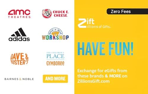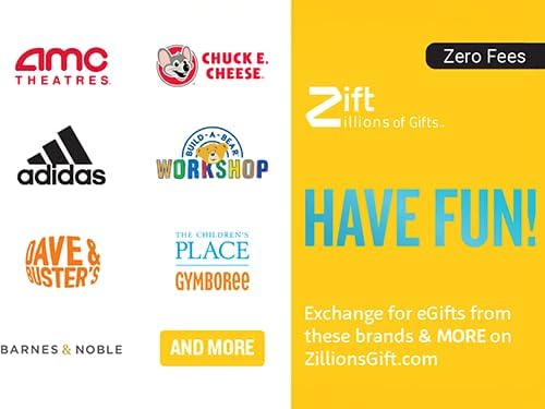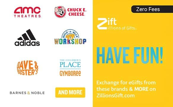 Redeem this Have Fun eGift Card for eGifts to brands such as: AMC Theatres, adidas, Barnes & Noble, Build-A-Bear Workshop, Chuck E. Cheese, Dave & Buster’s, The Children’s Place, AND MORE!