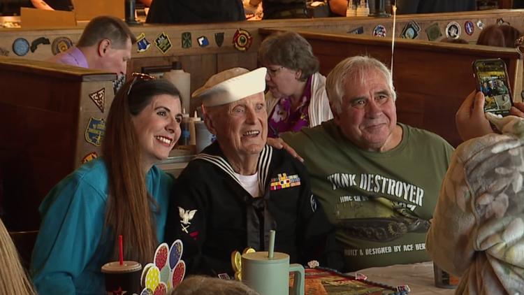 LUZERNE COUNTY, Pa. — A trip for Old Glory through tight quarters inside Mission Barbecue in Wilkes-Barre Township shows the volume of people who came out to wish U.S. Navy veteran Charles Brooking a happy 99th birthday.